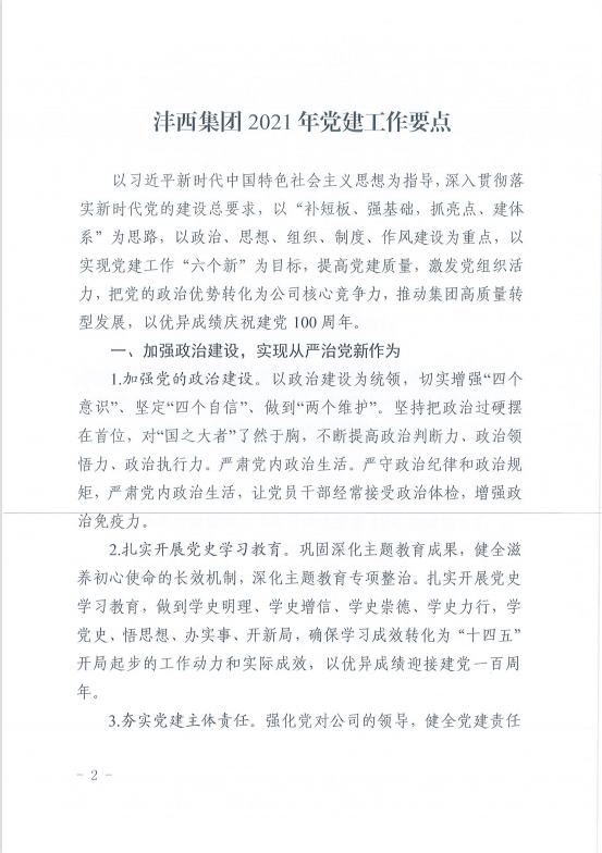 開展“黨建強 企業興”活動。堅持以“一流黨建引領一流企業”的工作思路,制定《灃西集團黨建工作五年規劃》,建立集團領導班子成員黨支部工作聯系點制度,健全黨建責任落實體系;優化公司黨組織架構體系,及時調整支部書記人選,并對集團新任支部書記及黨務干事進行集中培訓1次,對黨務干事進行常態化業務能力測試,指導項目部門黨支部探索黨建業務融合新方式,提升黨建品牌影響力,全面提升黨務工作水平。